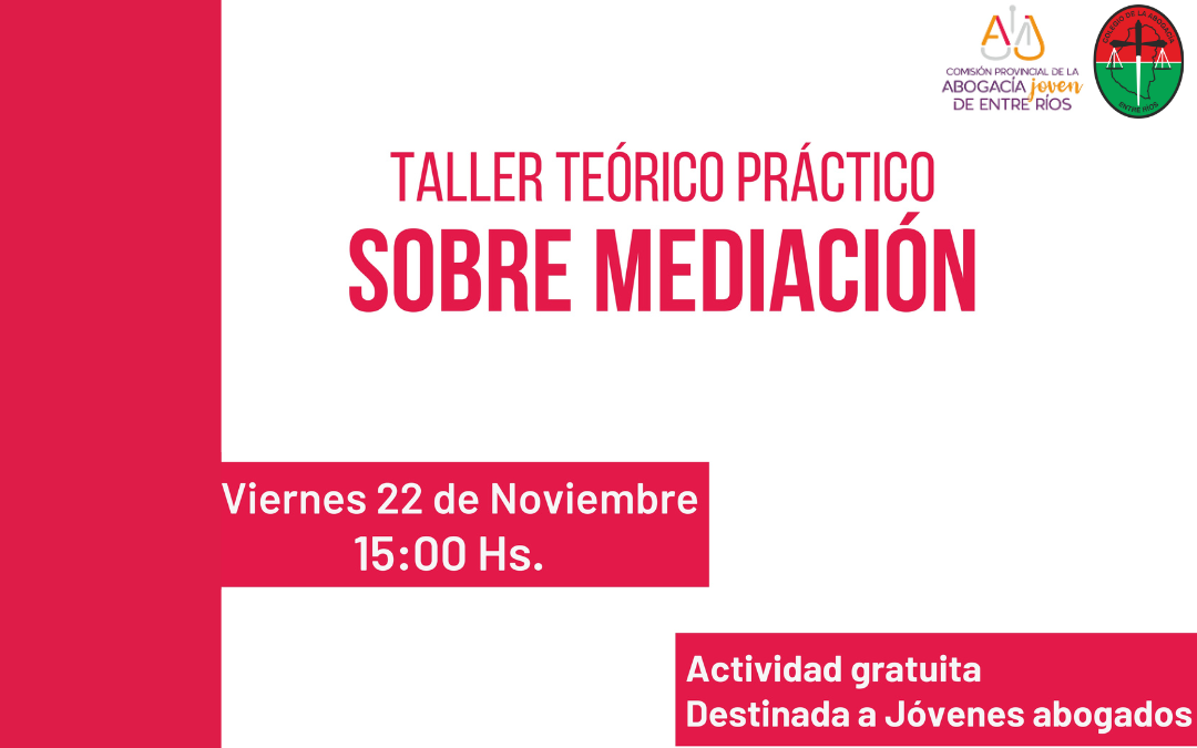El proximo viernes 22 de Noviembre, a partir de las 15hs, se llevará a cabo el Taller Teórico Práctico sobre Mediación.