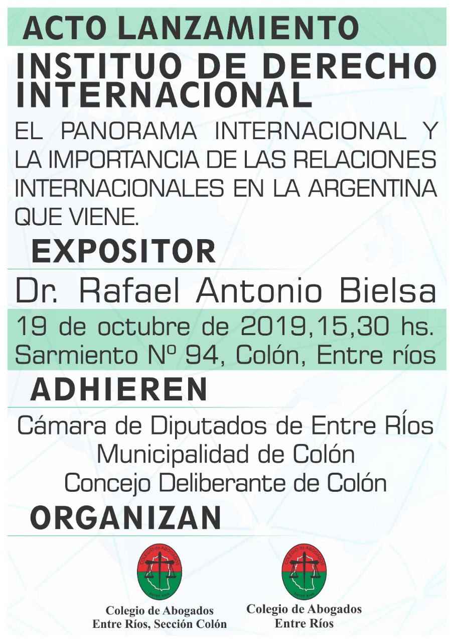 General Lanzamiento Instituto de Derecho Internacional Martes, 15 Octubre 2019 - 21:31 Copied to clipboard El panorama internacional y la importancia de las relaciones internacionales en la Argentina que viene. Expone: Dr. Antonio Bielsa 19 de Octubre de 2019 a las 15:30 Hs en Sarmiento 94, Colón, Entre Ríos.-