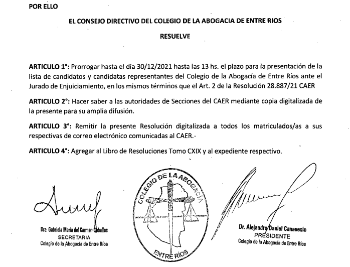 Ante un pedido de los apoderados legales de las diferentes listas, se prorrogó por tres días el plazo de presentación de candidatos a integrar el Jurado de Enjuiciamiento por el Colegio de la Abogacía. El plazo vence el 30/12 a las 13.